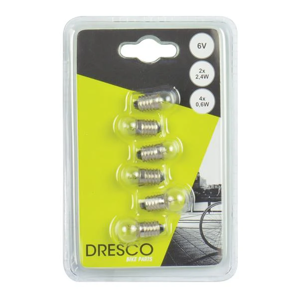 Avec ces feux de vélo Dresco, vous pouvez facilement et rapidement remplacer vos feux de vélo défectueux. Ce vaste ensemble de six feux de vélo se compose de deux ampoules de rechange pour le feu avant et de quatre ampoules arrière de rechange. Les lampes ont une tension de 6 volts et une puissance de 2,4 watts (lumière avant) et 0,6 watts (lumière arrière). Ensemble complet avec six feux de vélo Dresco. Deux feux avant et quatre feux arrière.